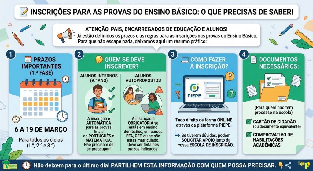 A inscrição para a realização das Provas Finais do Ensino Básico, das Provas de Equivalência à Frequência dos 1.º, 2.º e 3.º ciclos do Ensino Básico e das Provas a Nível de Escola do Ensino Básico dos alunos autopropostos, ocorre em formato eletrónico, integralmente online, através da Plataforma de Inscrição Eletrónica em Provas e Exames (PIEPE) disponível em https://jnepiepe.dge.mec.pt. e durante o período abaixo indicado: